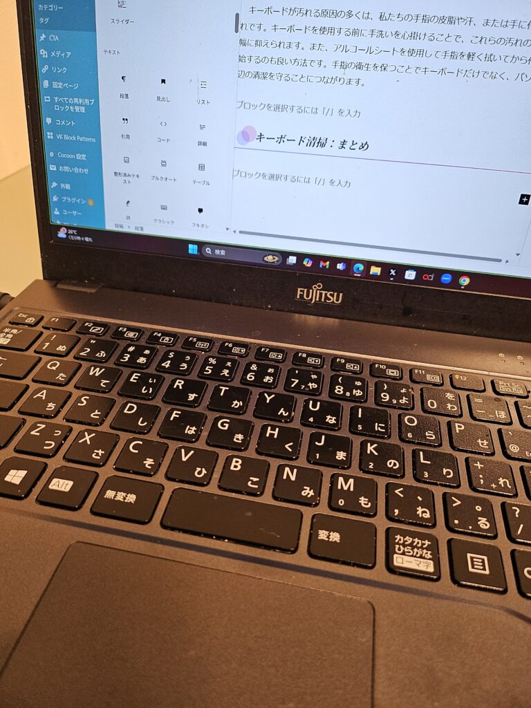 ただし、直接キーボードにアルコールを吹きかけると故障の原因になる可能性があるため、必ず布や綿棒に少量含ませて使用しましょう。また、作業中は十分に換気をすることも大切です。