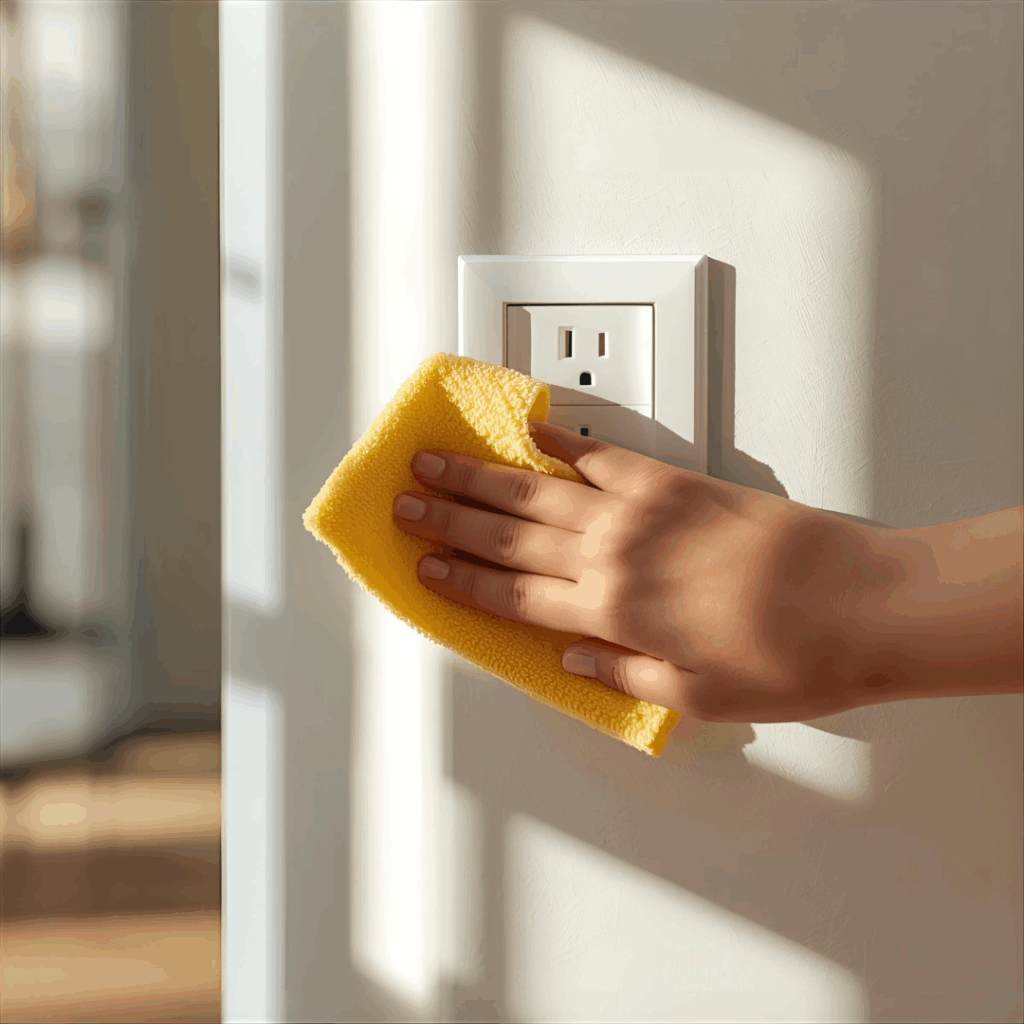 3. コンセント周りの壁やプラグ自体の表面を静電気モップなどで丁寧に拭き、汚れが残らないようにします。必要に応じて硬く絞った乾いた布を使用しても良いでしょう。